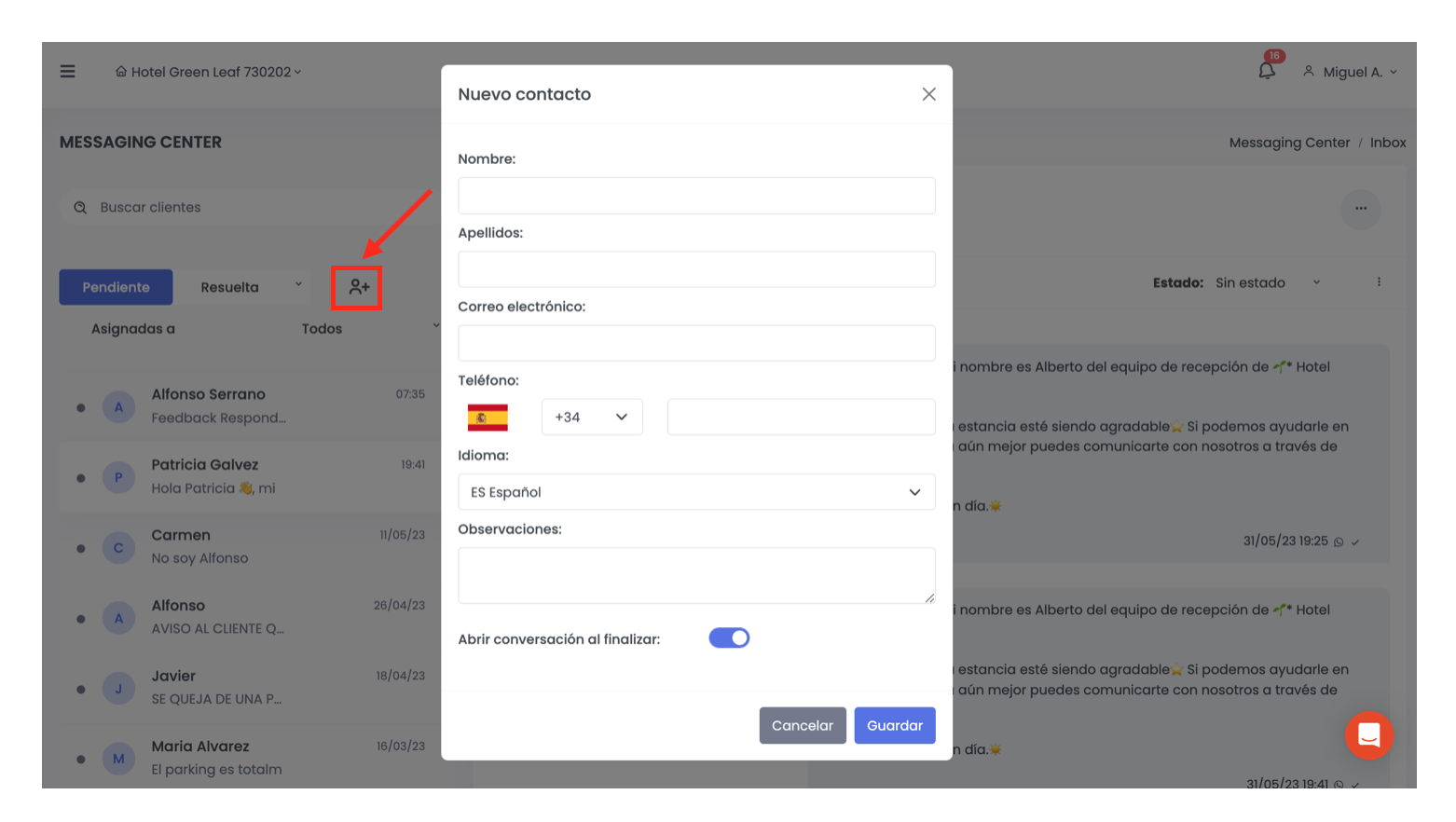 Es tan sencillo como añadir un nuevo contacto al sistema y abrir una conversación con él. Lo hacemos desde el icono de "añadir contacto" en Messaging Center: