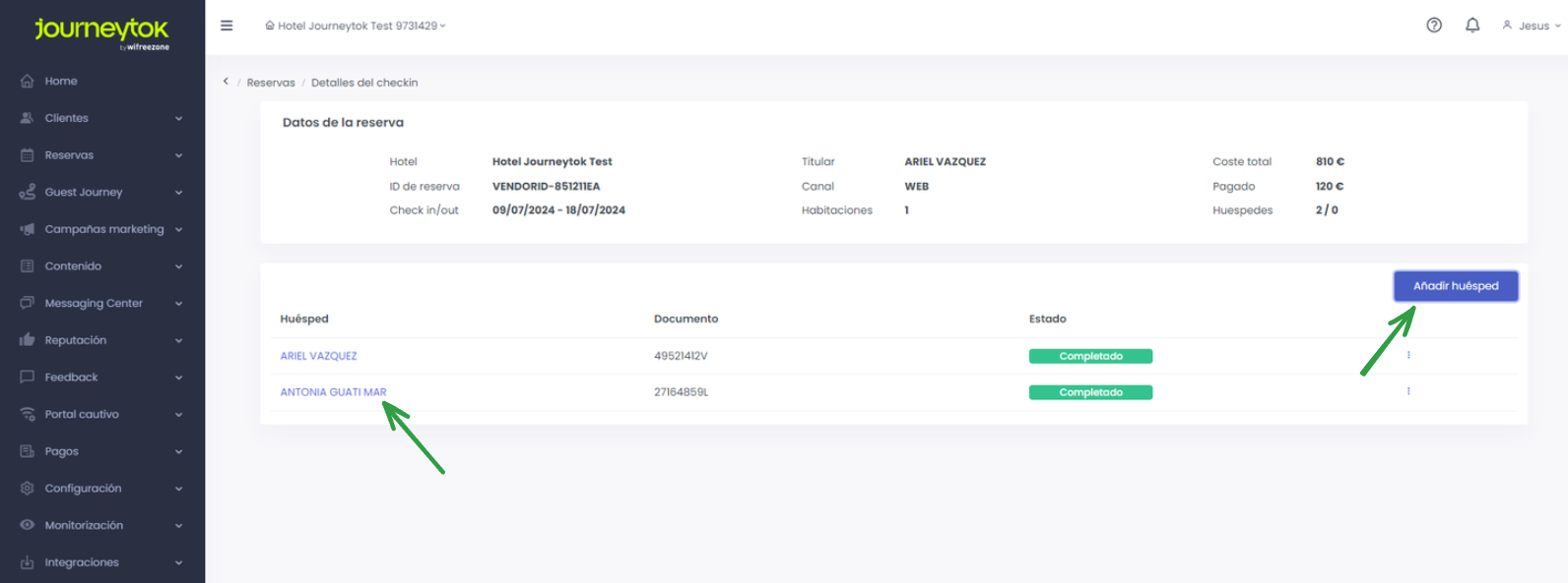 Entre la información detallada que se facilita, podemos encontrar "quien falta por completar el proceso" o "quien a finalizado su checkin", incluso tenemos la opción de "Añadir un nuevo huésped" a la reserva sólo con un click.