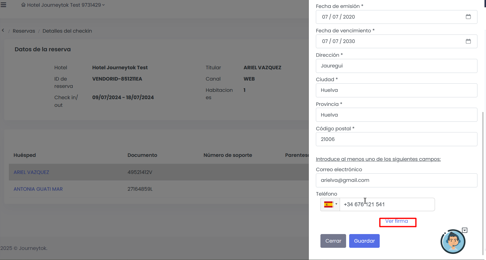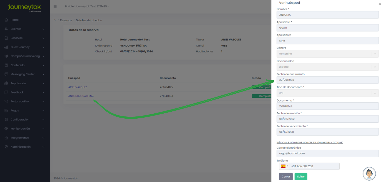 Desde esta misma vista, podemos acceder a los datos del cliente que ha realizado su checkin online, para ello haremos click sobre el nombre del cliente situado en la columna "Huésped" y a continuación se desplegarán todos sus datos, desde donde podemos modificar cualquier campo y guardar los cambios. Datos que serán volcados automáticamente al PMS.