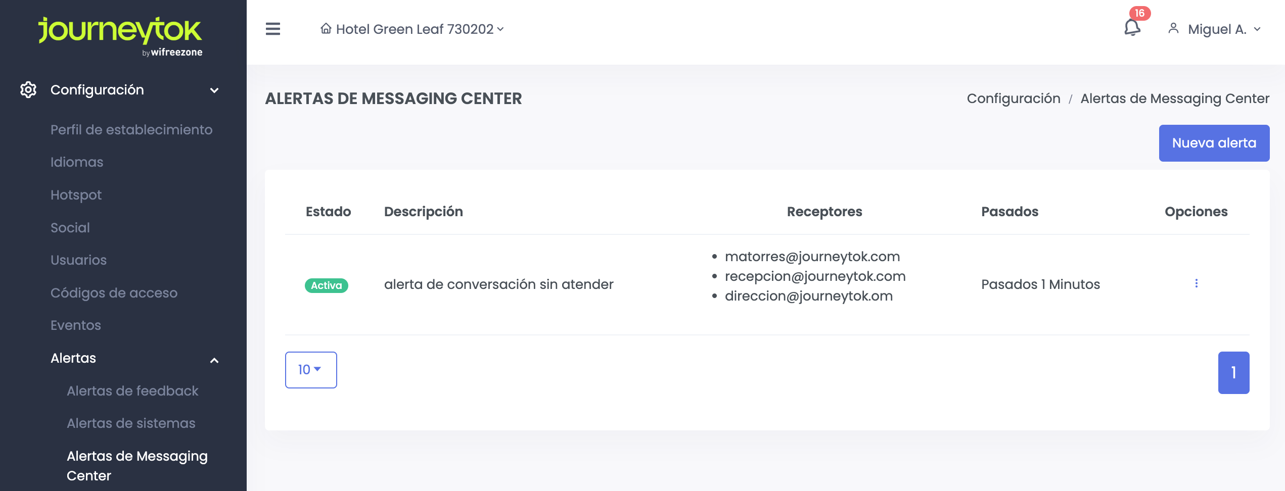 Para ello, podrás configurar la alerta desde el panel en el apartado de Configuración => Alertas => Alertas de Messaging Center