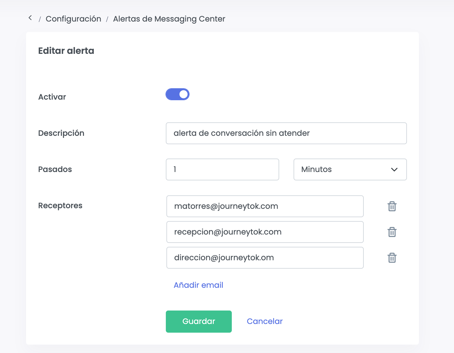 Nos mostrará un pequeño formulario en el cual podremos dejarla activa, añadir una descripción y configurar el tiempo que debe pasar desde que llegó una nueva conversación hasta que envía el correo electrónico. Sólo mandará la alerta si el mensaje no ha sido atendido, en el caso que haya sido leído ya no se enviará la alerta.